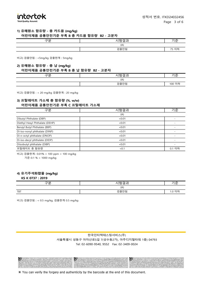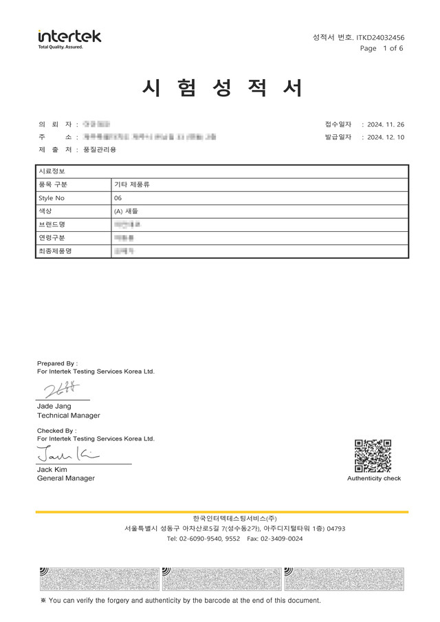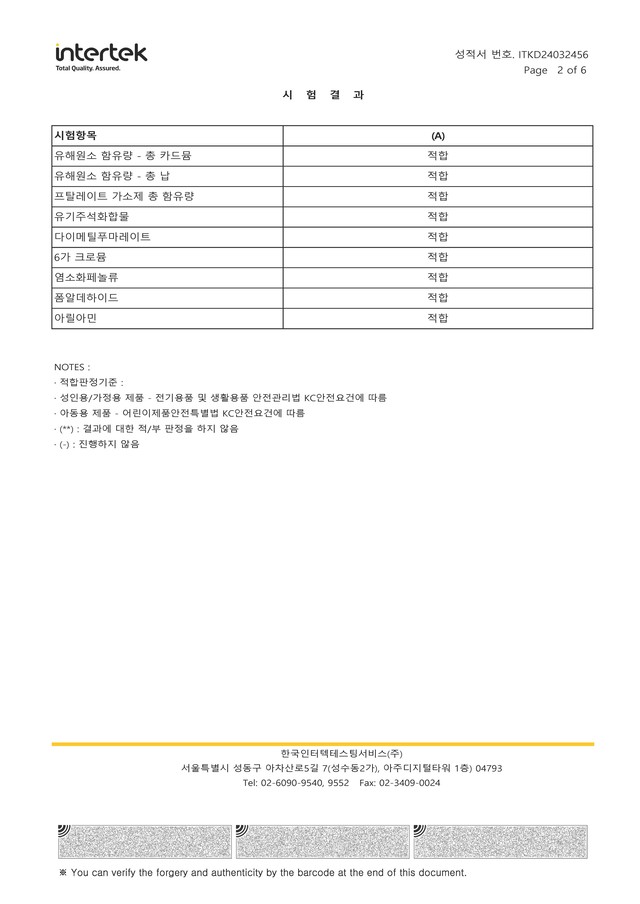 아동용 섬유 관련 유해물질 테스트 통과