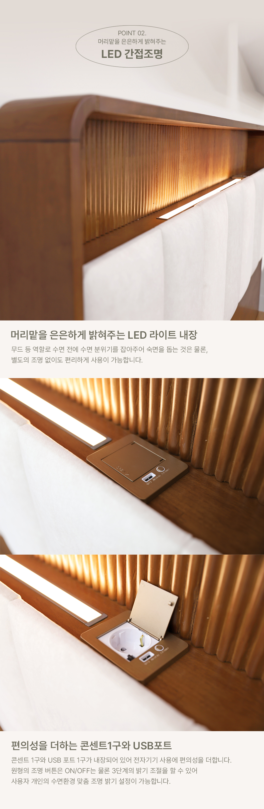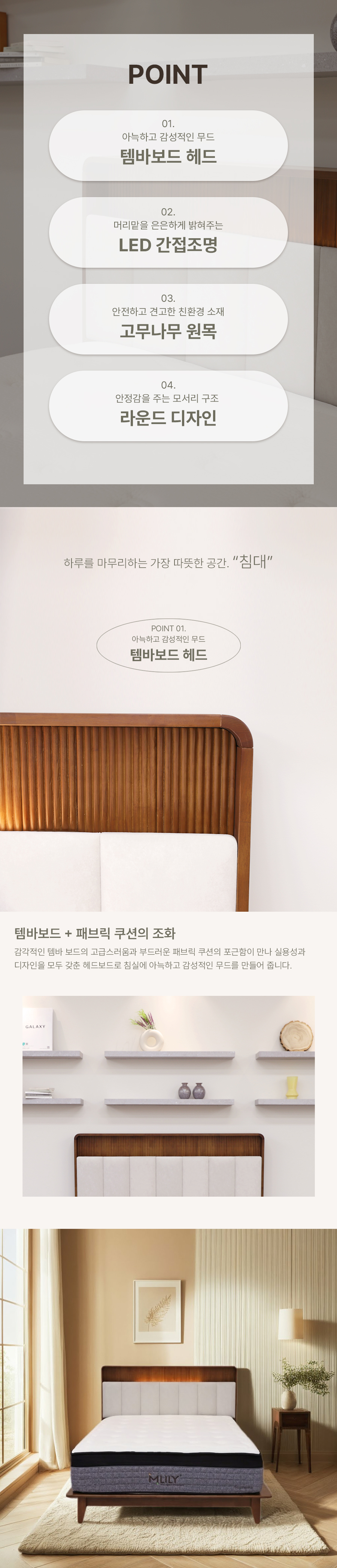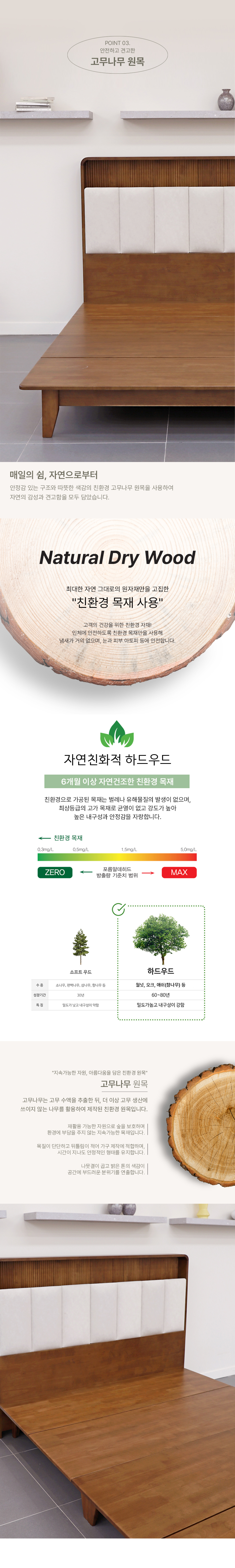 템바보드와 패브릭이 조합된 헤드보드가 감각적인 원목 침대 프레임