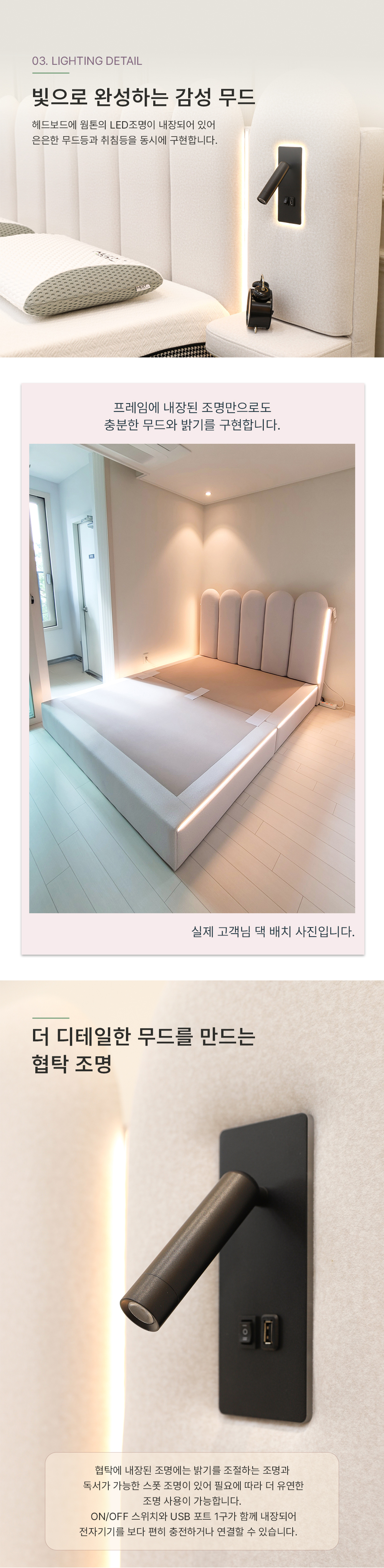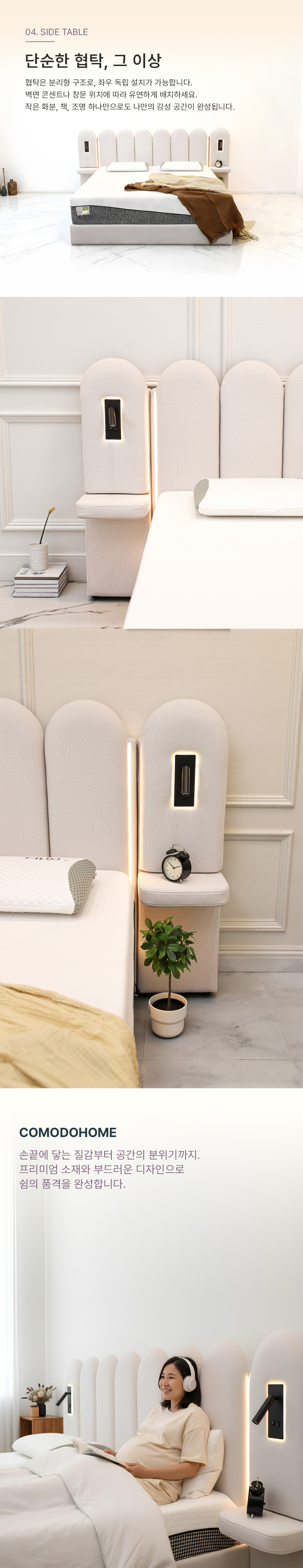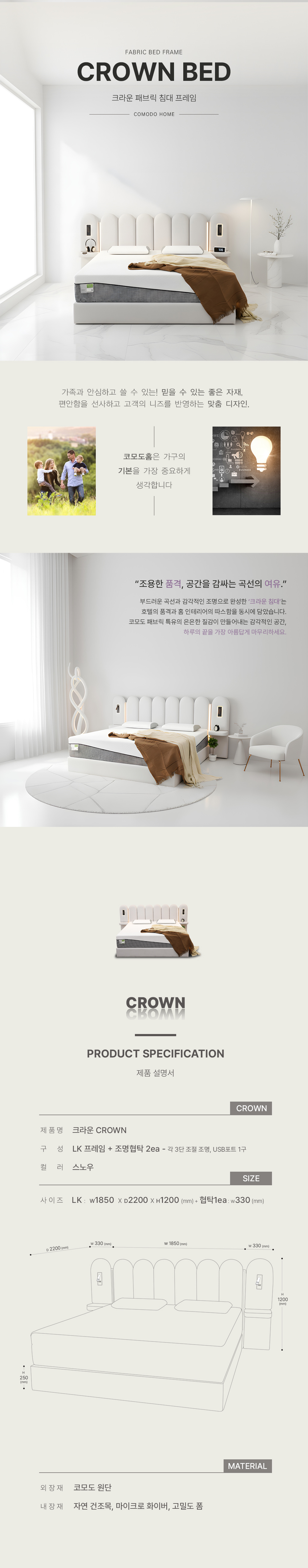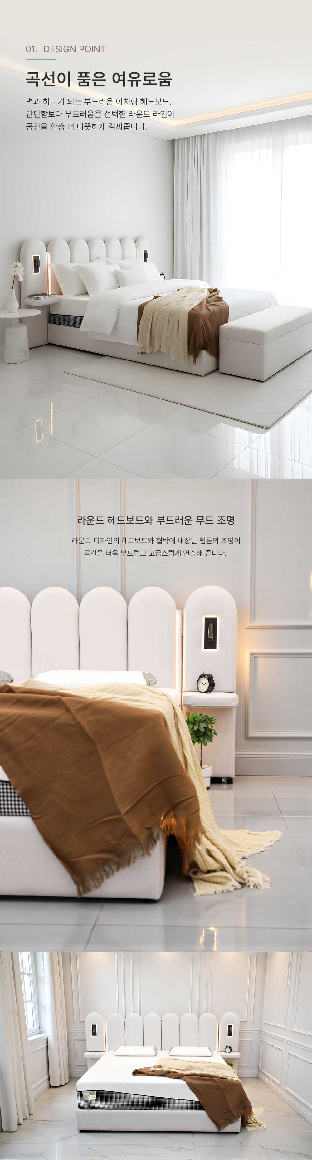 부드러운 라운드 디자인과 조명, 친환경 기능성 패브릭으로 더욱 편안한 패브릭 침대