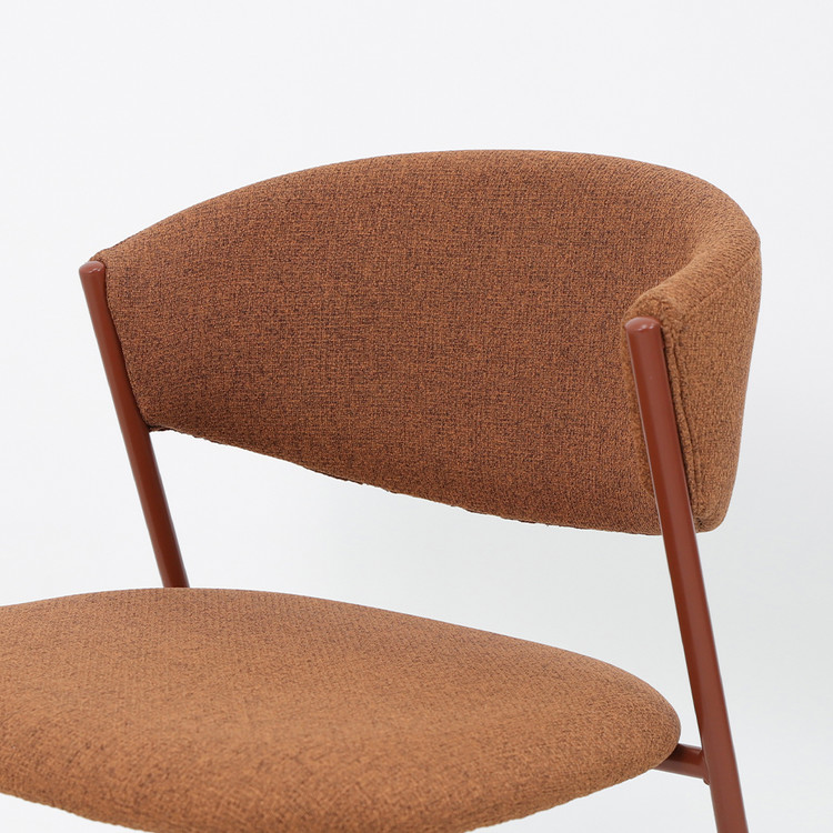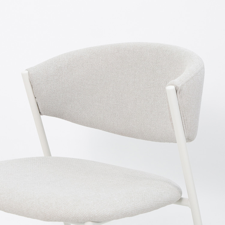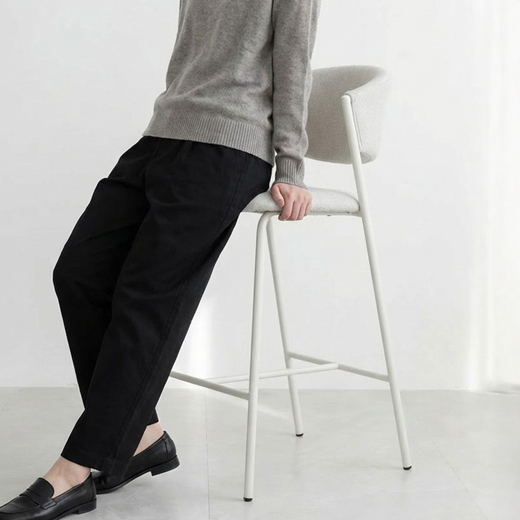 심플한 디자인, 부드러운 라운드 곡선 등받이, 미드센추리 모던 타입의 패브릭 바 체어.